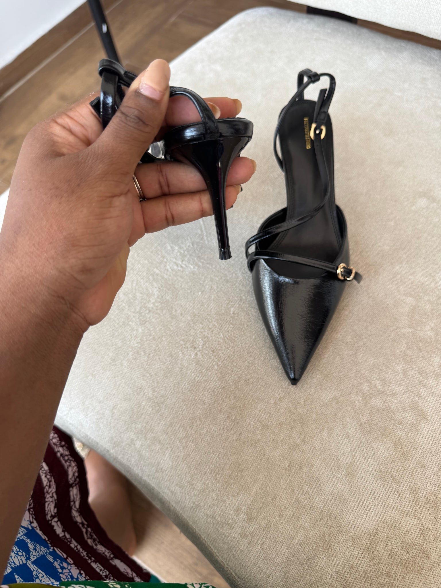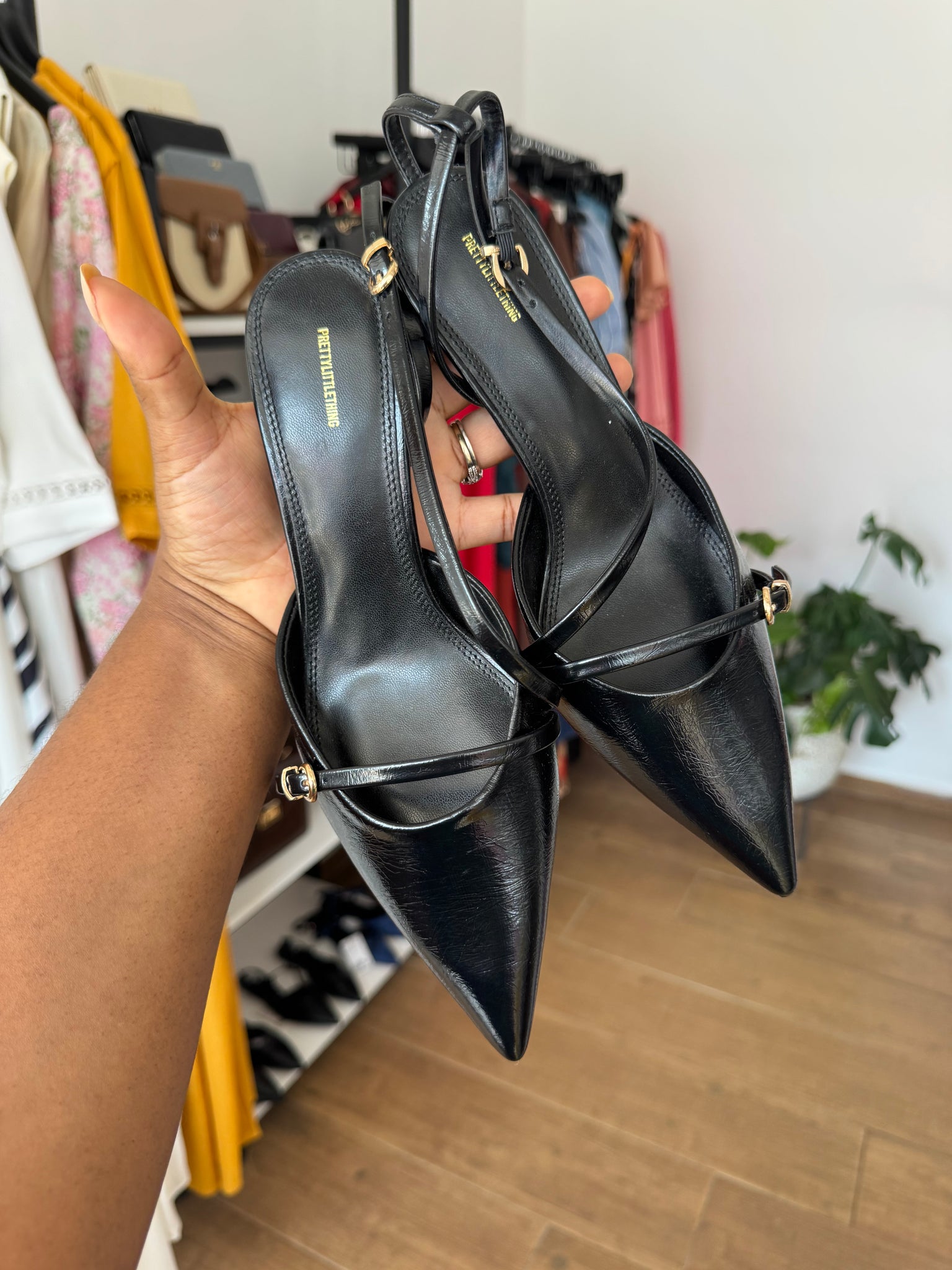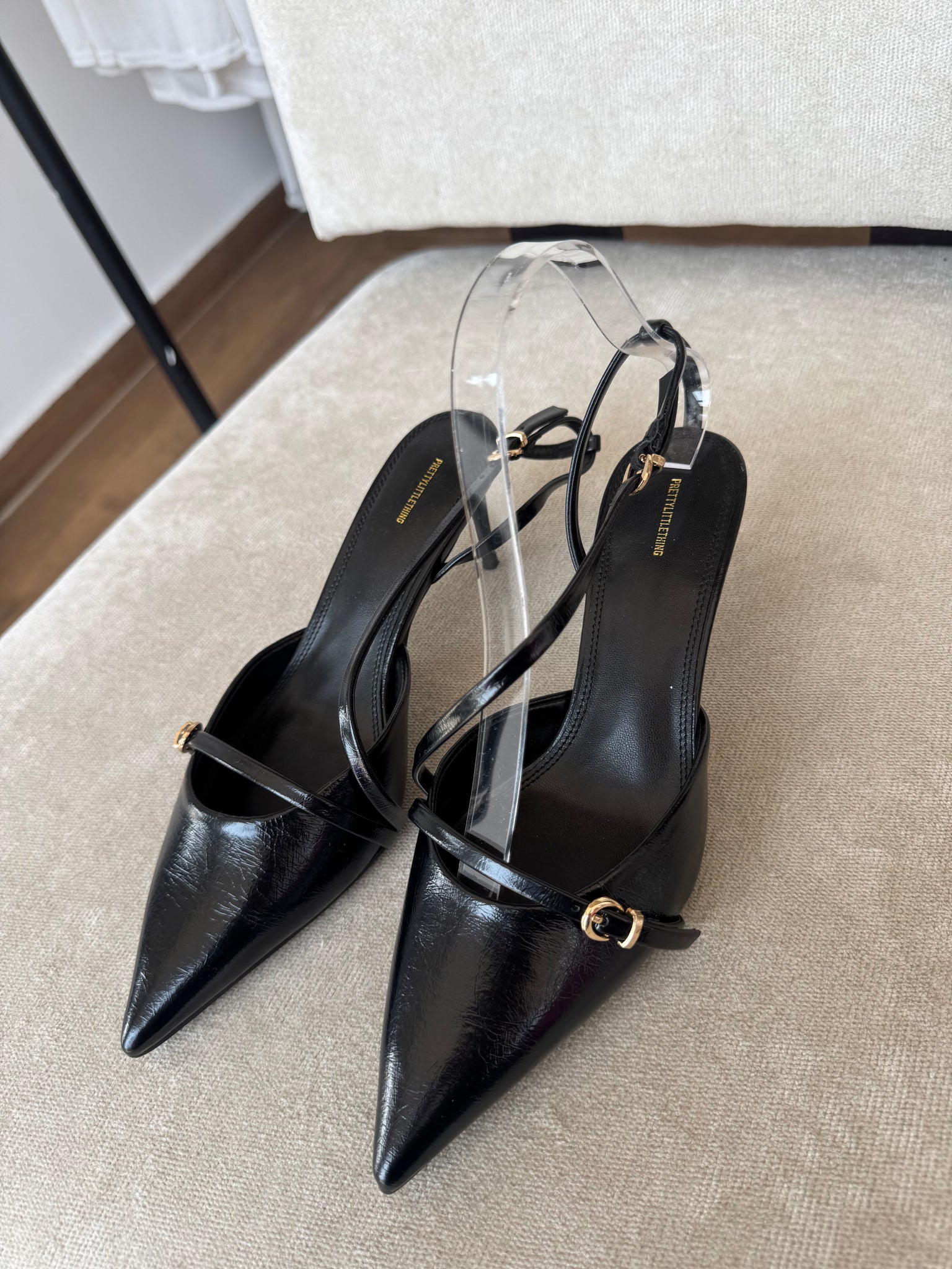 Black pointed sling back heels