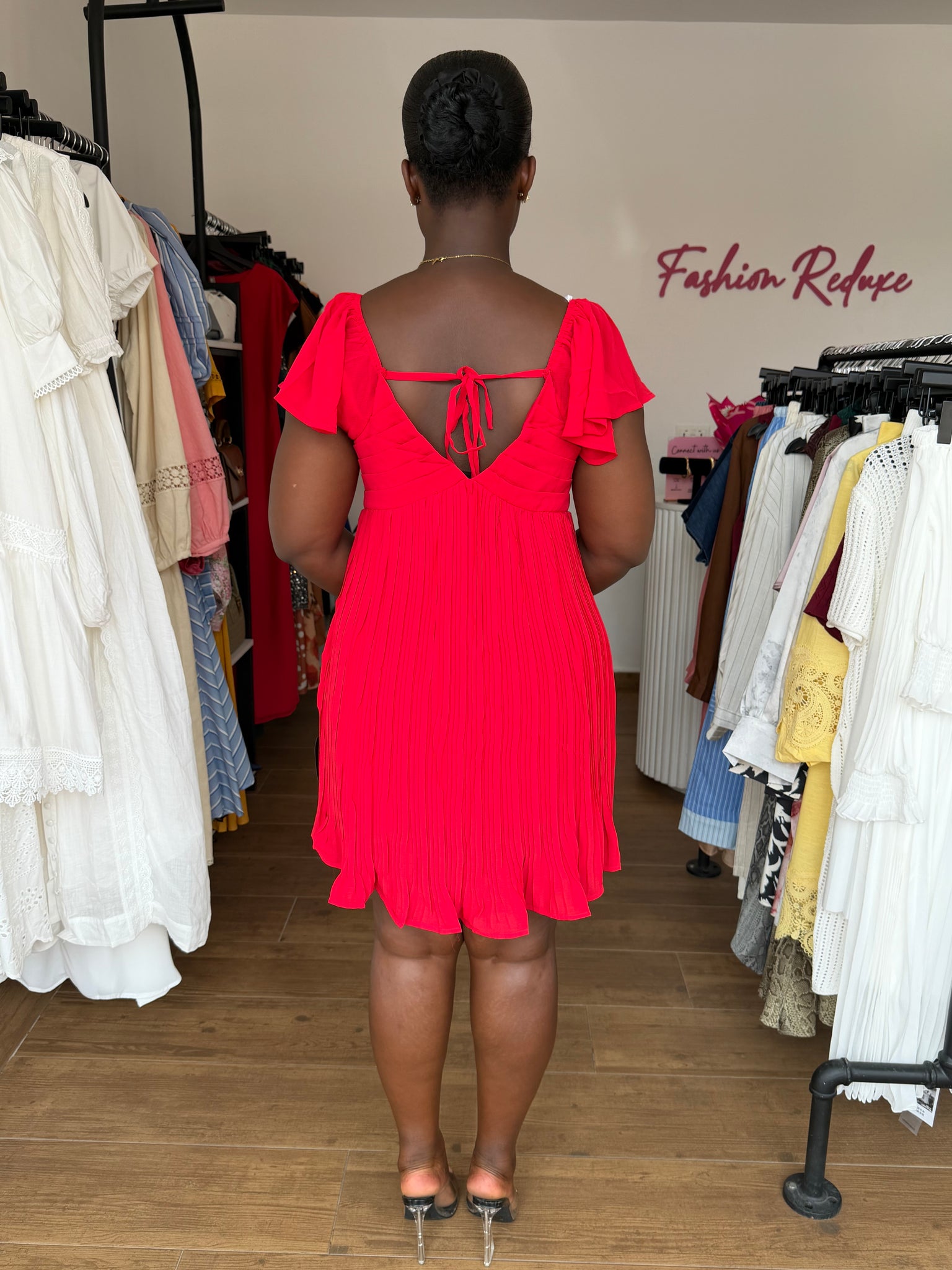 Red mini pleated open back dress